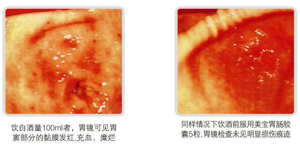 其三,及时修复损伤的黏膜:如果没有伴美宝胃肠胶囊饮酒,可能造成对胃肠的伤害,特别是为应酬超量饮酒,胃肠被急性损伤,出现恶心、呕吐、腹疼、头疼等严重疾病反应。出现这种情况,可及时补服5粒以上美宝胃肠胶囊,疾病反应越严重,服用量逐增,直至症状暂时缓解,如果是呕吐严重,则可将胶囊嚼服,一般情况,当胶囊内容物吞咽到胃内后疾病状态即可缓解,胶囊内容物立即贴附在黏膜表面,快速修复损伤的粘膜,一般24小时恢复损伤的粘膜,慢者三天内完成修复。