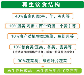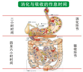 接下来讲作息时间,简单讲,人在饭后食物的下行时间。人的胃开始排空时间是2小时,所以6点吃饭,要8点胃排空后再睡觉,才会感觉舒服,要把胃排空的时间留出来,这些食物在小肠中再停留4—6小时,在这个过程中吸收营养。这就是人为什么要一日三餐的原因,也正是为了人体不间断的吸收营养。这样胃肠道在一天中都没有停下来,早饭后胃肠开始消化吸收,等消化完后就又开始吃午饭了,午饭消化吸收后又得吃晚饭,所以胃肠道一天都得工作,不能休息。因此我就提出人胃肠道的作息时间应该是,白天时要少吃,让胃肠略微休息休息,而且还能少牵涉人的精力。晚上睡觉时其他器官消耗能量少了,这时就可以多吃点儿,让胃肠道多干干活,吸收好营养。这就是我们提出的早吃好、午吃少、晚吃饱的生物钟饮食。吃什么大家都知道了,这个很简单,但是从机理上讲,吃的东西和细胞最后得到的营养的关系是比较复杂的。如吃了牛肉后,牛肉进入胃后,牛肉中的少量蛋白质就转化成了氨基酸,但大多是都是在肠道转化的;牛肉中的脂肪在胃中并没有转化,淀粉在胃内也不消化,只不过是胃酸和胃的研磨,把粗的淀粉变细了,基本上各种食物在胃内都能有一定的转化。很多人认为饭后人就会有劲儿,实际上并不是这样的,刚刚饭后是最没劲儿的时候,许多的心脏病等疾病都是在饭后发作的,这都是吃饭累的,人在吃饱饭后就会像爬山一样累了。一旦食入食物,胃就会启动,胃会根据摄入食物的不同会产生大量不同的消化液,比如人在喝了糖水之后,就会感觉胃酸,糖引起了大量胃酸的分泌。吃几份不同的食物胃肠道也就会产生相应的几份消化液。因此建议大家在吃饭时一定要多样化,食物过于单一,胃肠道就会失去相应的功能。按照我们今天所讲的再生养生标准吃就会达到多样化饮食,蛋白质、脂肪、维生素、矿物质等全部都有了,消化液的分泌就会均衡。有些人减肥时光吃水果,结果肥是减了,但却检查出了癌症,这就是因为其营养不均衡,细胞得不到充足的营养,饿出了癌。
