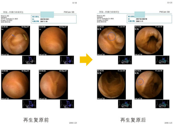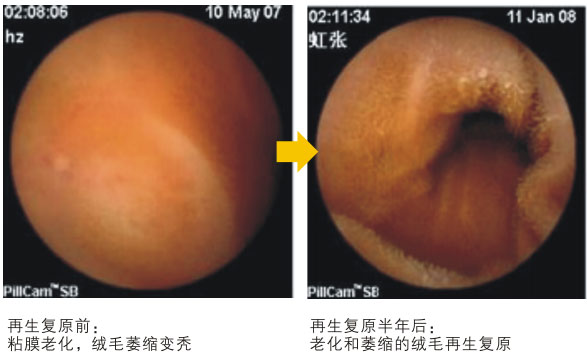 作者:徐荣祥 出版社:中国科学技术出版社 发行日期:2009年7月 这个例子(下图示)是2007年5月10日再生养生前的胃镜检查结果,显示肠绒毛部分脱失,全部萎缩,经过再生复原6个月后胃镜显示肠绒毛大部分再生了,胃肠年轻化。这在科学史上是史无前例的,而我们却完成了,在座会员的胃肠道也会产生同样的变化,即使七八十岁的老人在经过再生复原之后也会使部分肠绒毛再生。胃肠再生是器官再生的最好写照,比手指再生还要重要,因为在再生更新胃肠道之后,其他器官也将会再生更新。患有12年冠心病的患者在进行全身再生复原后,冠心病治愈了,这也让所有的医生感到惊奇,因此可见通过胃肠道的改善,可以将身体的其他器官全部改善。在改善胃肠道之后,即使不再食用再生物质,进食普通食物也将会使生活质量比原来大大改善。