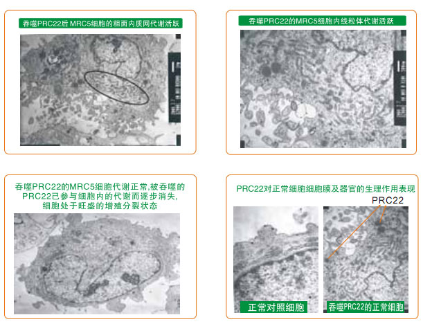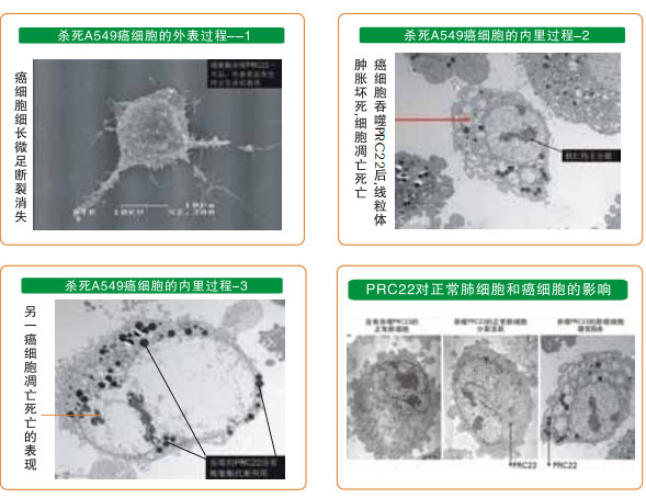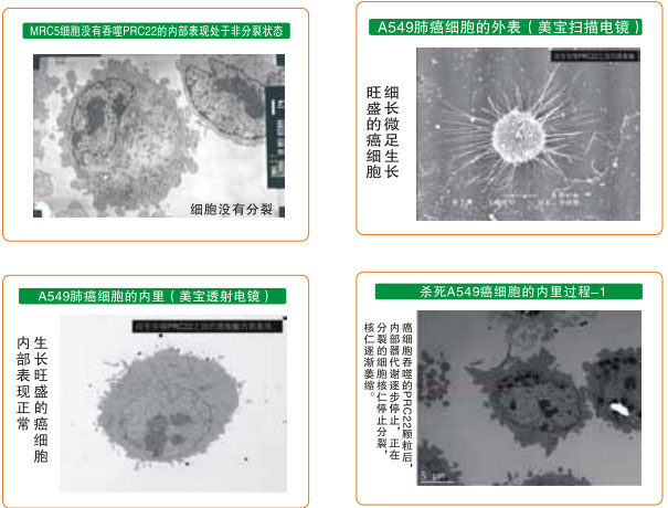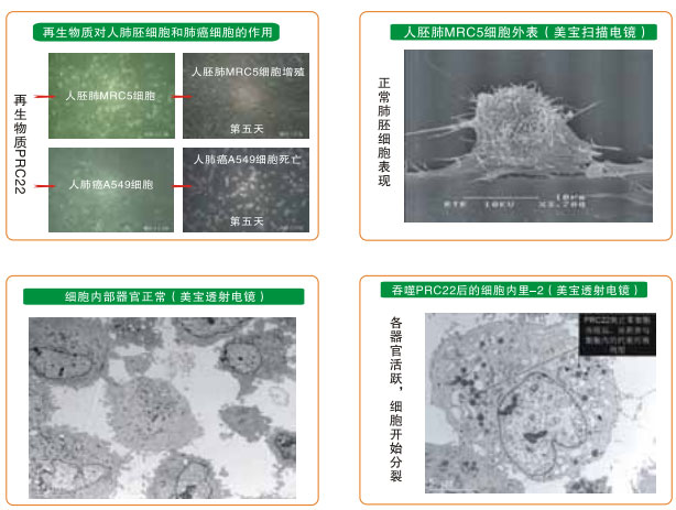 在获得再生物质对癌细胞生命作用研究结果的基础上,我们选人胚肺MRC5细胞作为正常细胞,人肺癌A549细胞作为癌细胞,用人肺组织的再生营养物质作为试验物质,对正常细胞和癌细胞进行体外培养,观察再生物质进入细胞内是如何产生作用的。其结果为,正常细胞吞入再生物质后,细胞内的各个器官代谢旺盛,细胞核分裂表现活跃,再生物质在细胞内被代谢消耗;没有加入再生物质培养的正常肺细胞对照组的细胞,没有产生明显的增殖变化。而肺癌细胞吞入再生物质后,细胞内各器官代谢立即停止,第一天,细胞自断伪足,细胞内的线粒体肿胀死亡,细胞核仁萎缩,吞入的再生物质没有发生代谢消耗性反应,第二天后细胞凋亡性死亡,吞入的再生物质完好无损。如此的试验结果认为,再生物质对正常细胞内各器官的作用是一种再生营养素,而对于癌细胞内的器官则是致死性物质。试验结果还表明,再生物质的作用首先发生在细胞质内的器官中,而后影响细胞核内。这样的结果所见可能是人类攻克癌症的一个崭新途径。(参见下列系列电镜图片)