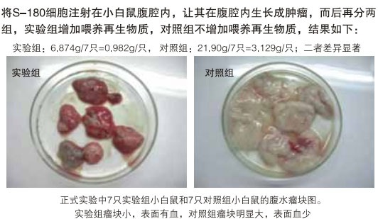 将S-180细胞,注射到小白鼠腹腔内,让其在腹腔内形成肿瘤组织,在形成一定大小时分为两组,一组增加一定量再生物质的喂养(实验组),一组不加再生物质喂养(对照组)。一段时间后,将小白鼠腹腔内的肿瘤组织取出,进行称量,喂养再生物质组的小白鼠肿瘤组织块明显地小于没有喂养再生物质组小白鼠腹腔内的肿瘤组织块,数据是:实验组0.982g/只,对照组3.12g/只,且肿瘤组织的颜色外观明显不同。