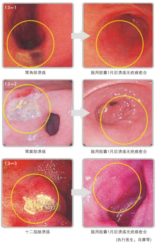 2. 胃肠溃疡:这些疾病,目前医学上采取的是疤痕修复溃疡创面,从而导致复发不愈。采取本再生疗法,新的胃肠粘膜可从溃疡的创面上原位再生出来,取代了溃疡创面,没有疤痕,彻底治愈了胃肠溃疡。(图13 为胃镜图片)