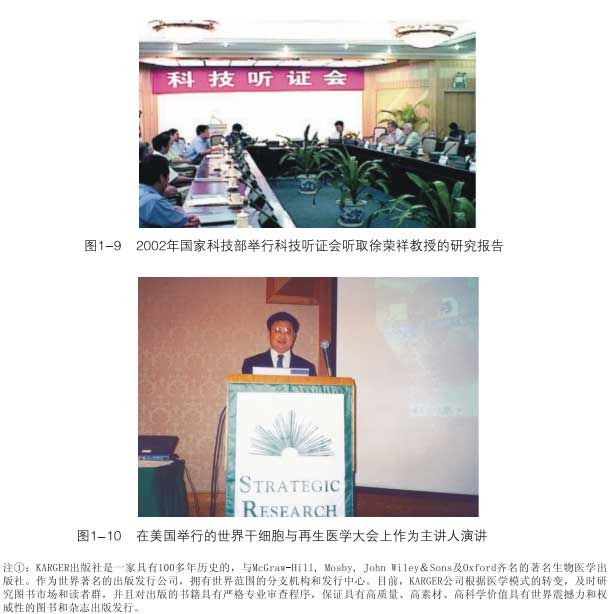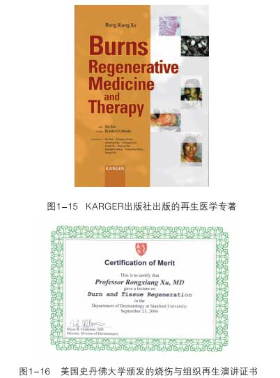 虽然我们在国际国内学术会议上反复地讲解身体内由体细胞转化为干细胞的实际规律,但世界胚胎干细胞研究的狂潮席卷生命科学界,各大学和医院都设立胚胎干细胞研究室,都在按同一个梦想奋进。于是,我们又在2002年8月,搞了一个生命科学大爆炸新闻发布会,宣布已成功地实现了体细胞转化为干细胞(潜能再生细胞)再克隆器官的全过程,公布了克隆出的组织器官实物,并宣称5年后完成人类组织器官的全部复制。国家科技部也组织院士进行了科学听证会议,随即,美国举行的世界干细胞与再生医学大会和在新加坡举行的干细胞大会特约我做嘉宾作如何用体细胞克隆组织器官、和临床如何用于治疗创伤和胃肠溃疡疾病的专题演讲。2004年,世界三大医学文献出版社之一的瑞士KARGER出版社①正式出版了我的再生医学英文专著《烧伤再生医学与疗法》,封底书评介绍,这是一本用临床应用实践陈述普通细胞原位再生皮肤器官过程的书,对细胞生物学、干细胞研究、免疫学研究等,都有着极其重要的价值。出版社为了对大家的科学研究产生有利的作用,在出版社的网站上写道:这是一本“革命性的和令人惊奇的”著作。这样的呼吁,在世界范围内产生了较大的影响,比如德国、英国、美国等国知名的生命科学家专程来华与我们交流干细胞的研究,瑞典科学委员会委托国家电视台专程来华采访。美国史丹佛大学特约去大学作专题学术报告,美国哈佛大学皮肤学教授们专程到家里进行学术交流。