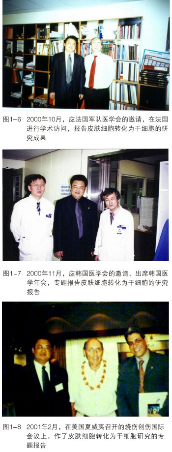 21世纪前叶,美国科学杂志将胚胎干细胞研究评为1999年度世界十大科学成就之首,但惹来了生命伦理的争论。而我们的研究早已破解了皮肤器官再生的秘密,则在1997年培训全国的高级职称医生如何再生复原大面积深度烧伤后的皮肤。当看到几乎是全世界的生命科学家都掀起了胚胎干细胞研究的热潮时,我们的心情同样是激动,但这种激动并不是欢呼胚胎干细胞的研究,而是为这种热潮感到担心,因我们的研究所得到的干细胞规律并不是他们想象的那样,作为生命科学的研究者都应该懂得,细胞生命规律无论是胚胎来的干细胞,还是成体组织来的干细胞,其生命规律是一致的。不应该再出现别的规律。究竟是谁对谁错?我们肯定的回答,我们的发现不会错!因为我们是从已经获得的器官破解的干细胞生命规律,是已经完成和实现的。而胚胎干细胞想象的克隆器官的规律只是幻想出来的,还没有实践证实。于是,为了给世界热衷于胚胎干细胞研究的生命科学家提个醒,我们于2000年6月正式出版了著作,公布了皮肤组织细胞可转化为干细胞再生器官的临床结果和生命规律的秘密。并举行了中外新闻发布会,为了让大家深刻地明白,我们又借助《科技日报》,进行了几万字的破解体细胞转干细胞再生器官探秘过程的曝光报道。这是人类发明体细胞转化为干细胞、原位再生复原组织和器官科学体系的科学突破起始点。相继于2001年举行了胃肠组织细胞克隆胃肠器官获得成功的中外新闻发布会,重复了皮肤细胞转化为干细胞的科学规律。在完成系统的研究后,我们申报了这一科学平台的美国、欧洲、中国专利,现已获得专利权。(附一组在国际上传播体细胞转化形成干细胞成果足迹的照片)