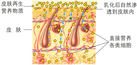 ● 再生营养物质被皮肤吸收或从肠道吸收后,再生营养皮肤内的附件、神经及血管,保持和再生复原附件功能的正常。