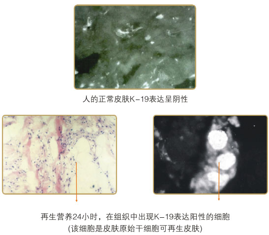 ● 再生营养物质被皮肤吸收后,再生营养皮肤基底层及真皮组织的干细胞,恢复和再生复原其器官和组织的结构和功能,保持表皮及真皮内上皮组织、皮肤内各器官旺盛的活力,预防和阻止皮肤衰老引起的色斑等异常皮肤疾患。附角蛋白19型干细胞研究图片。
