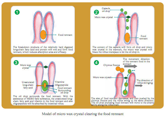 Increase nutrition absorption area: MEBO Gastrointestinal Capsule will form tiny crystal body after entering the intestinal tract. This crystal body will adhere at the positions among the intestinal villi and they will clear the accumulated food remnant automatically with the peristalsis of intestinal tract. Then the absorption surface of the villus is enlarged, which will promote the ability and efficiency of nutrition absorption.