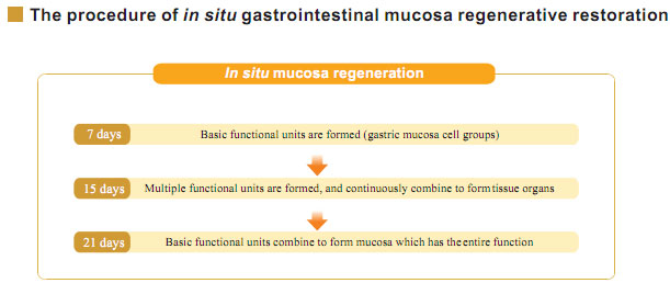 The MEBO regenerative restoration technique can supply necessary nutrition for the gastrointestinal mucosa stem cells and also the in situ tissue cells, consequently the potential regenerative cells and stem cells will be initiated for proliferation and differentiation at the injured site to achieve the regeneration & restoration of the injured or ulcerative mucosa without scar formation. The original physiological function and structure can be recovered through this process.