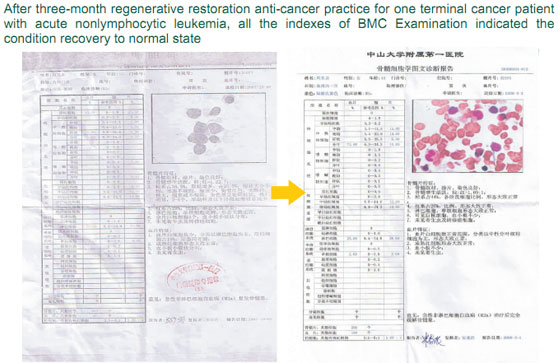 The second case is a leukemia patient. Though leukemia is considered as a challenging disease, it is not so tough for our therapy. In our animal study, regeneration of the bone marrows by our method could not be hindered by 60Co radiation compared with the control group in which deterioration occurred in the marrow after radiation. This patient was diagnosed as leukemia repeatedly relapsing,to whom the medical intervention was withdrawn. She was admitted in our program in early February of 2008. The latest examination on March 3rd of 2008 showed her bone marrows had been converted to normal completely with her physical condition the same with the normal people.