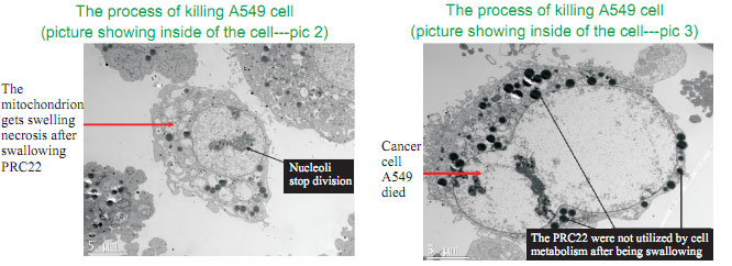 But why? What are the mechanisms behind it? Before I answer your question, let me show you the results from our study first. For the morphology of the normal human lung cells cultured in MEM with regenerative nutrients, it was obvious that the normal lung cells were not only alive but began to proliferate after swallowing No.22, indicating the regenerative nutrients contained in No.22 can be used by lung cells and involved in their construction process; in addition, regeneration was throughout the development of lung cells accompanied by active division without variation. On the contrary, no division was observed in the normal cells cultured without No.22 at the same time interval. More surprisingly, after cancer cells were cultured in the same media with No.22, the absorbability of the cell was decreased, cell organs turned to disfiguration, which finally led to the cell death. There are two types of cell death: apoptosis and cell disaggregation (usually with toxin release). In our study, the death of cancer cells was determined as apoptosis for no disaggregation was observed.