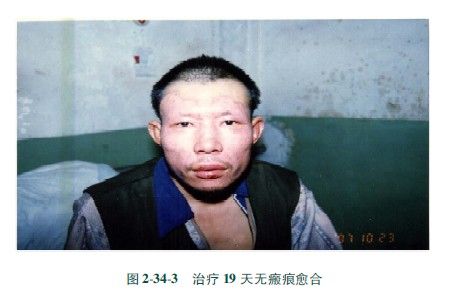 (3)深Ⅱ度深型创面25天内愈合,愈合皮肤表面粗糙,皮肤附件毛孔粗大,毛发稀少,质地稍硬,留有色素沉着。