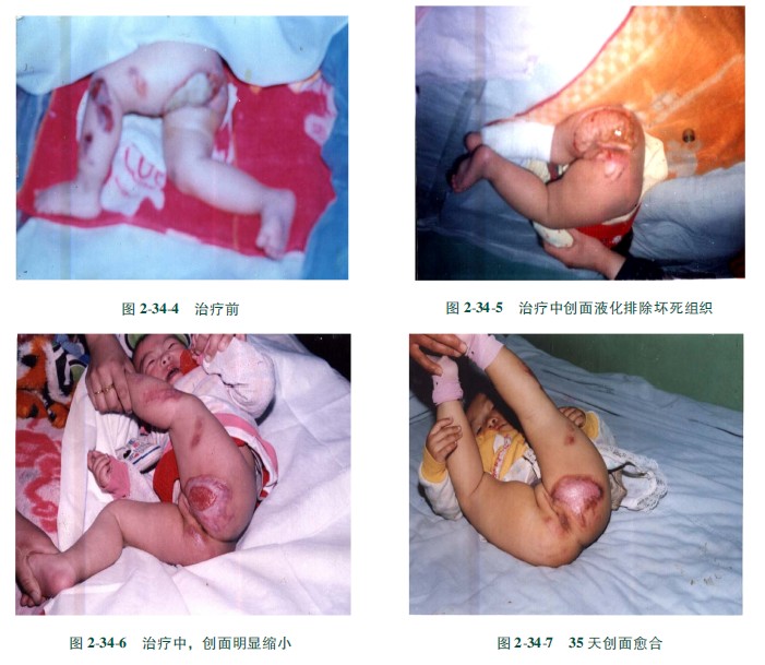 【病例2】患儿,女性,1岁,从火炕掉在铁炉盖上造成臀部左下肢深度烧伤,臀部创面呈瓷白色,为典型深Ⅲ度创面,全程应用MEBT/MEBO治疗,35天痊愈。