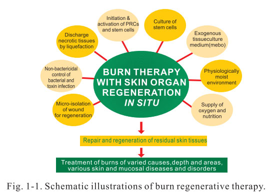 As early as before 1989, we have matured burns skin regeneration therapy that was derived from successful burns treatment in clinic practice. Subsequent to burns, the human body has an instinct to initiate the regenerative potential of stem cells in vivo and in situ. However, the typical use of disinfectants and antibacterial agents on burns wounds makes it impossible to create a physiological environment sufficient to initiate and activate stem cell activation in burns wounds. The goal was to maintain and promote stem cells in order that they might proliferate and differentiate to further repair and clone organs.