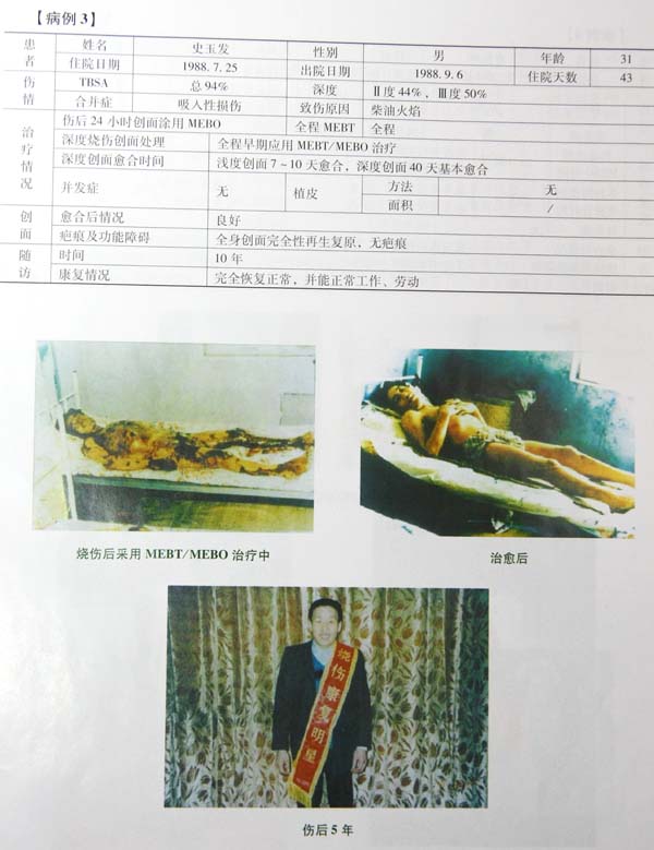 中国中西医结合学会烧伤专业委员会全国医疗网广大医护人员应用烧伤皮肤原位再生技术成功救治了大量的重症烧伤患者,在历次全国烧伤创疡学术会议上,经过专家委员会评审,已经有100名经治医师获得“全国烧伤康复明星奖”,以下展示的是部分获得奖励的大面积重症烧伤患者应用烧伤皮肤原位再生技术治疗前、治疗中和康复后的图片和病例资料。