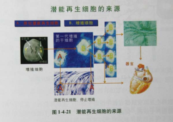 潜能再生细胞是与组织细胞在一起的、有潜能的、静态的、原位性的和有干细胞再生功能的成体细胞(图1-4-21)。