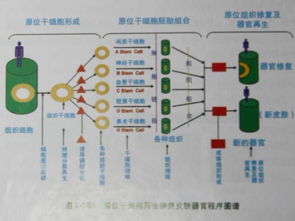 从原位干细胞再生复原皮肤器官程序图谱中看出,皮肤原位再生复原技术包括三个方面:一是原位激活启动潜能再生细胞,促进其形成干细胞;二是原位干细胞的组织组合;三是皮肤组织器官的再生组合。