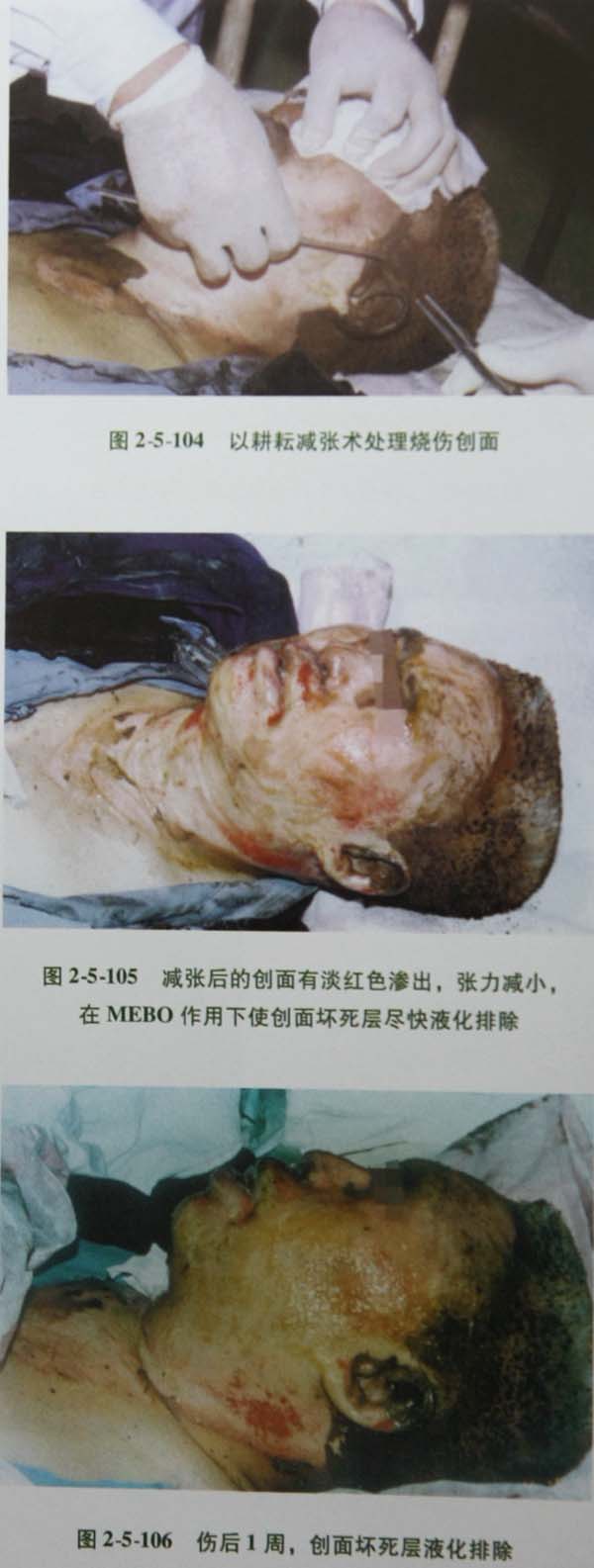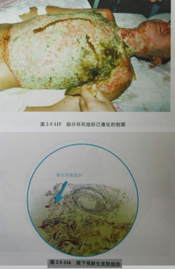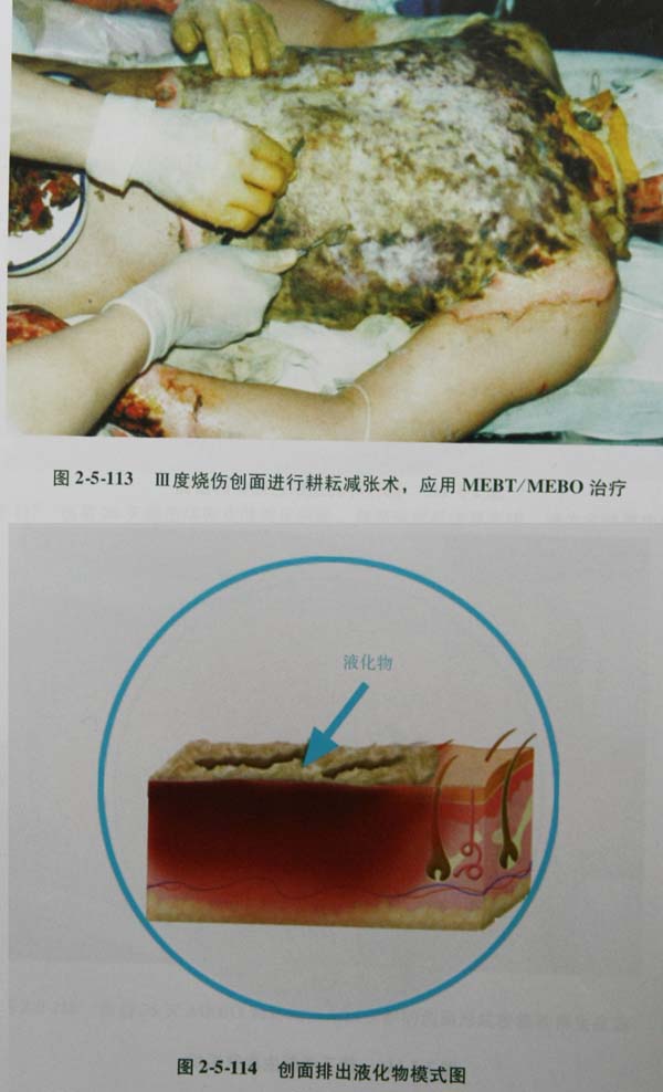(3)大面积烧伤有休克者,在休克期过后,应尽早微创外科手术介入法,清除创面坏死组织。中小面积Ⅲ度创面,伤员无休克者,可先涂药后薄化,也可先薄化后涂药,均可获得尽早清除坏死组织的目的。