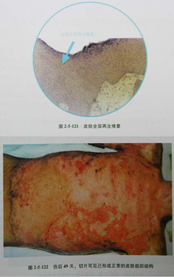 35~65天,残存附件上皮细胞再生,新皮色素沉着与色素缺如相间,继续护肤治疗2年好转;若不治疗逐渐形成花斑样瘢痕,一旦瘢痕形成,关节部位仍会发生瘢痕挛缩,尤其小儿常见。