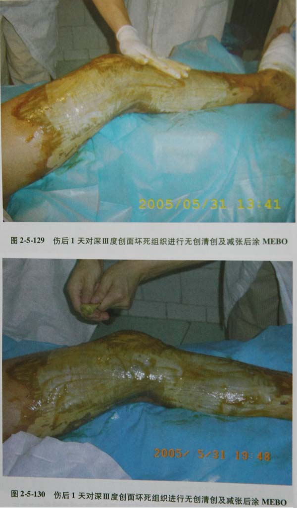 2在Ⅲ度深型创面的处置过程中,MEBT/MEBO仍不失为一种疗法,早期创面可在MEBO保护下采用外科手术薄层切削坏死焦痂(坏死组织薄化技术),以减少烧伤毒素的吸收。但以创面保留部分坏死组织为度(即切除坏死组织的2/3或3/4),以尽量保留有活性的组织为原则,并始终以MEBO保护创面,促使创面残存的坏死组织液化排除。