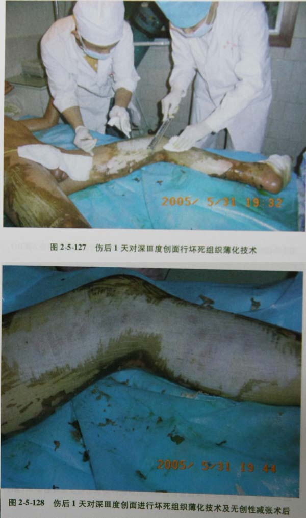 (1)焦黄或炭化,焦痂质硬干燥、凉,不治疗或采用干法治疗者,伤后1~2天透过焦痂可见栓塞的粗大血管网或切开焦痂见肌肉紫暗无收缩性或关节、骨骼外露。