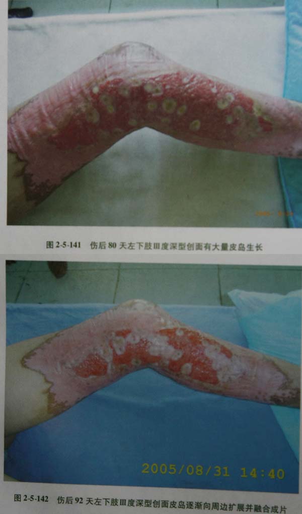 3超过45天创面未出现皮岛的病例可择期采用自体皮簇内植术治疗创面,术毕继续应用MEBO外涂,可促进皮片存活、再生伸展愈合并减轻瘢痕的生成,保证功能的恢复。