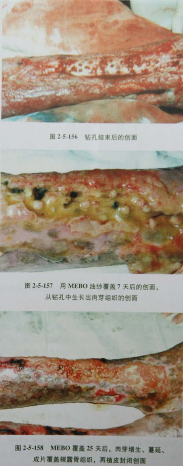 2已出现骨组织暴露,则采用暴露骨骼的清创钻孔,然后以MEBO营养保护创面,一般在7~15天即可见暴露骨骼的钻孔部位长出肉芽组织,此种肉芽组织在MEBO的作用下逐渐扩展以至覆盖暴露的骨骼,继续以MEBO换药促进创面产生K19(19型角蛋白),培养皮肤组织愈合创面。
