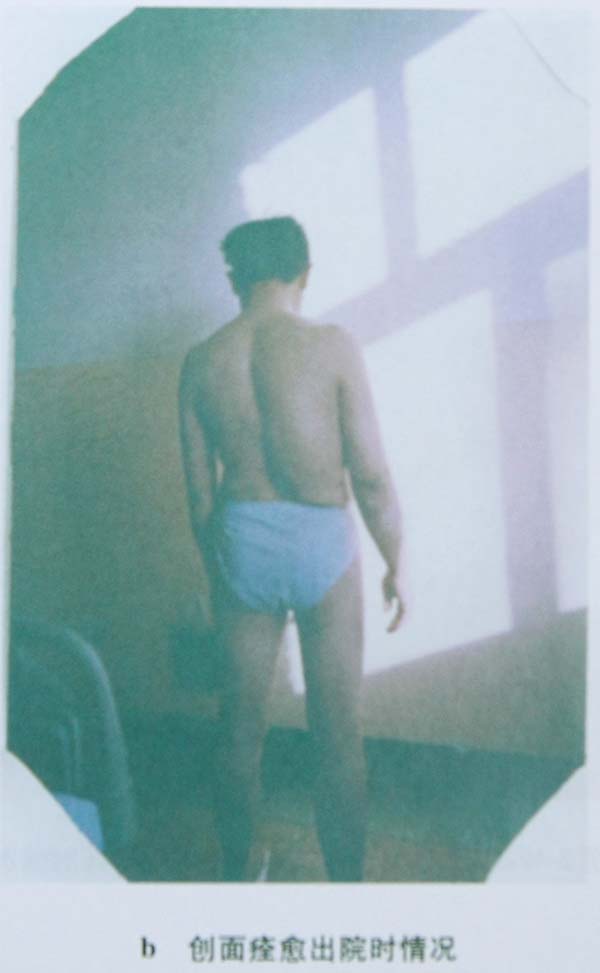 作者:徐荣祥 出版社:中国科学技术出版社 发行日期:2009年7月[病例3]患者贾××,36岁,石家庄市尼龙厂工人,住院日期2004年9月4日,出院日期2004年11月30日,患者于工作中不慎从五米高处摔下,跌入电石炉中,造成全身碱烧伤,急入石家庄井陉矿务局医院就诊。入院诊断工业碱水全身Ⅱ—Ⅲ度烧伤总面积达92%TBSA(浅Ⅱ度40%,深Ⅱ度27%,Ⅲ度浅型10%,Ⅲ度深型15%)。即刻采用美宝湿润烧伤膏外涂保护创面,同时采取全身系统治疗。包括强心、抗休克、抗感染、保肝、保肾、保护胃肠黏膜、持保水、电解质平衡和酸碱平衡、营养支持等综合抢救措施,创面全程规范应用烧伤皮肤原位再生技术和专用药品美宝湿润烧伤膏。患者于入院后24小时,发生全身侵袭性感染,血常规WBC由13×109/L下降到5×109/L、PLT由147×109/L下降到8×109/L;肝功 谷丙转氨酶高达362U/L,精神差,腹胀明显,体温395℃,呼吸浅快,36次/分。心率快,134次/分。口唇紫绀,创面灰暗,并见片状出血点,考虑为脓毒症及并发肝、心等脏器功能不全。当即给予高效、足量抗生素控制感染,加强心脑肝肾等脏器的支持保护,对创面进行彻底清理换药。