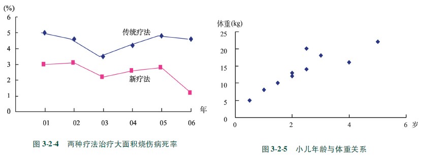 适用于描述双变量计量资料的两个定量变量之间的关系,它用线段的上升与下降表示某事物在时间上的发展变化趋势,或某现象随另一现象变迁的情况。绘制线图的要求是两个变量的观察值必须一一对应,即某一个变量的观察值仅对应另一个相应的观察值。它以自变量的观察值为横坐标,以应变量的观察值为纵坐标,在平面直角坐标系中,用点的形式描述出每一对观察值所在的位置,然后用直线连接相邻的点。