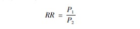 RR通常用于前瞻性研究。公式中的P1和P2分别表示同一事件在两种不同情况下的发生率。一般用P1表示暴露在危险因素下某事件的发生率;P2表示未暴露在危险因素下某事件的发生率,两者之比值具有倍数关系。事件指的是诸如患病、死亡、感染、发病等。
