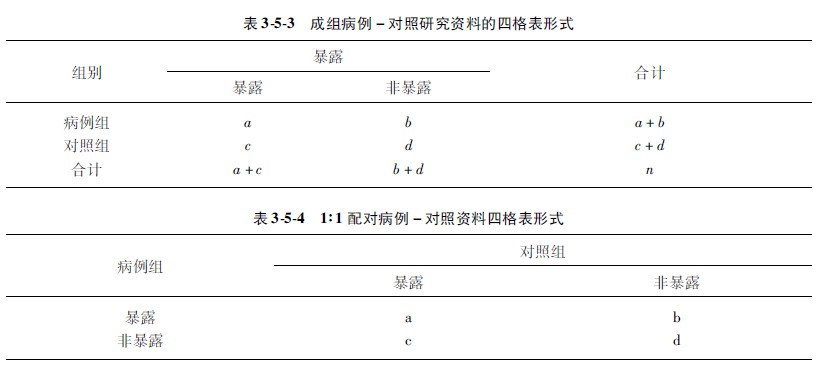 “病例-对照研究”是通过回顾方法比较病例和对照患者在患病前暴露于某种可能的危险因素方面的差异,分析该因素与疾病的可能关系。病例-对照研究中,如果病例组与对照组的暴露史只取暴露和非暴露两个水平,常用设计方法有两种,一个是成组的病例对照设计,另一个是配对的病例-对照设计,即1∶1配对设计。它们虽然都是采用四格表排列形式,但内容布局不一样(见表353和354)。