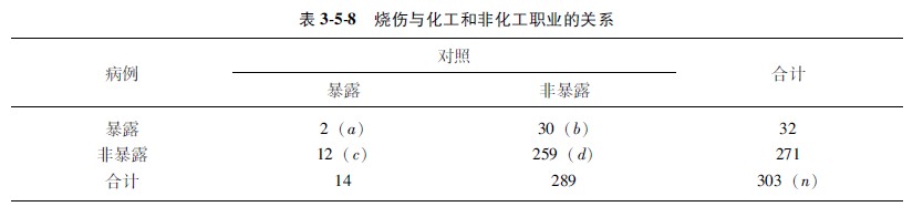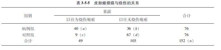示例353某医生研究皮肤瘢痕癌与烧伤瘢痕的关系,资料汇于表355中。问烧伤瘢痕是否是构成烧伤瘢痕癌的危险因素?
