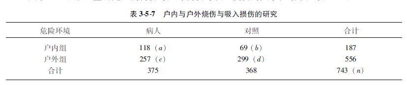 示例355:某医生研究户内烧伤与户外烧伤与吸入损伤的关系,结果见表357: