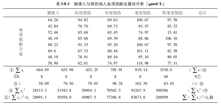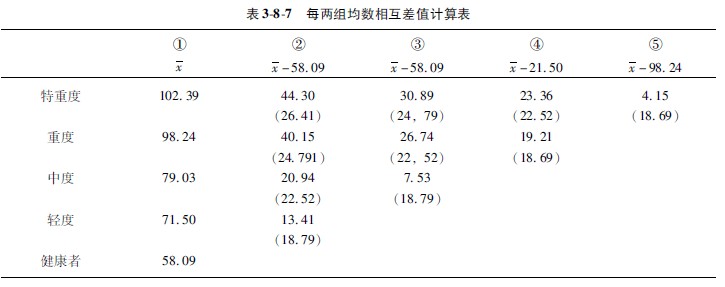 5结果判断与分析:根据表388中的数据,判断分析健康人与烧伤病人血清肌酸含量平均数有无显著差异。由表388②和③栏得知,轻度与中度烧伤病人肌酸含量均数的差值均小于Q×sx值(13,41<1879;753<1879),即健康者同轻度与中度烧伤组之间无统计学差异。由③栏看出,重度与特重度病人肌酸含量均数的差值均大于Q×sx值(4015>2479;4430>2641),故认为他们之间有显著性差异。由第③栏得知,中度烧伤病人均数的差值小于Q×sx值,与健康者无统计学差异;而重度与特重度病人肌酸含量之间均数差值均大于Q×sx值(2674>2252;3089>2479),故认为轻度与中度烧伤病人血清肌酸含量与健康人之间无统计学差异,重度与特重度烧伤病人血清肌酸含量与轻度和中度烧伤病人有显著差异,而特重度病人肌酸含量也显著高于重度病人。