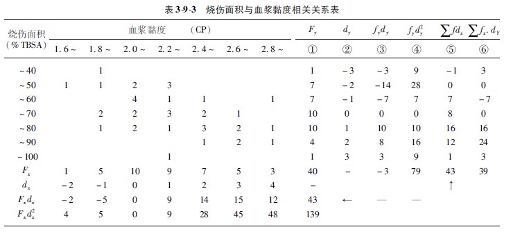 (1)作相关计算表(表393):先将资料按烧伤面积(竖行)和血浆黏度(横行)填入表中,再将竖行与横行相交的病例数(频数)填入相应之交叉处。如“~40%”TBSA组段血浆黏度在“16~”段处有1例,即在此处填1,余仿此。