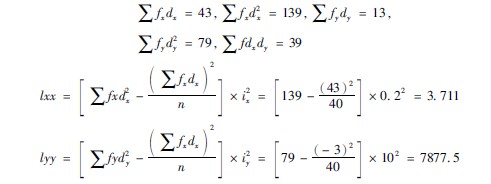 (2)参照平均数值及标准差的简捷法,分别求出x及y的dx简化值(dx、dy)、∑fxdx、∑fydy、 ∑fxd2x及fyd2y,填入表的响应位置(注:∑fx=∑fy,本例均为40)。