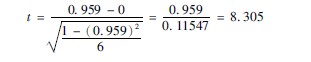 本例自由度为(n′)为6, P005界值为2447,P001界值为3707,本例t=8305,不仅大于2447,也大于3707,故P<001,即相关系数非常显著。