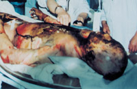 患者李××,男性,35岁,于1996年4月12日晚8:30在水泥窑崩塌事故中被近1000℃炽热水泥灼伤及火焰烧伤,伤后4.5h急诊入院。诊断为:①热冲复合伤;②大面积深度烧伤(烧伤总面积85%);③重度吸入性损伤;④休克;⑤双足多发性骨折。