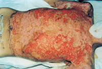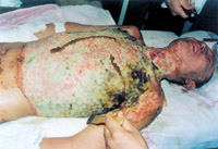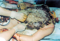 患者入院时,病情严重,处于休克状态。大面积深度烧伤创面被水泥粉贴覆,鼻毛烧焦,水泥呼吸道吸入,呼吸音变调,声音嘶哑,紧急作气管切开,对创面行MEBT/MEBO加耕耘疗法治疗,对全身进行综合治疗,创面组织学检查为Ⅲ度烧伤。