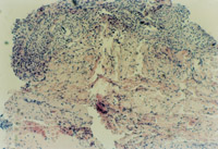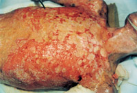 3-21 烧伤皮肤处理结果是坏死皮肤被液化排除,成活烧伤组织被保留,皮下组织之上形成肉芽创面,其中有新皮点出现。(伤后第20天)