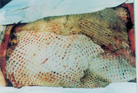 3-8 将异体皮拉网式覆盖在手术后的创面上。4天后将自体皮切成碎粒(或片)嵌入异体皮的网洞内