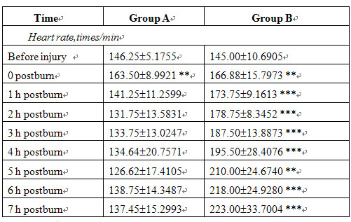 Before injury and at 5 min after injury, RR, HR and ABP were not significantly different between the two groups. In group B, RR and HR increased, ABP decreased progressively postinjury and the blood viscosity was raised markedly after treatment compared with that of before treatment. In group A, the MEBO-treated group, the RR, HR and ABP of all animals gradually recovered to the preinjury levels after treatment while blood viscosity decreased significantly (Tables 3, 4).
