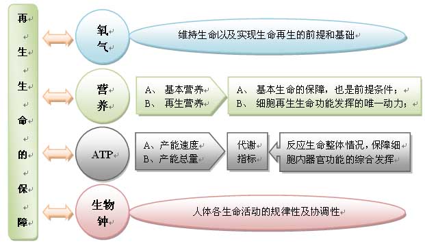 既往我们已经知道“氧气、营养、ATP、生物钟”是驾驭人体再生生命的四大指标,也是临床再生技术的操作指标及人体生命活动的观察指标,它们与人体再生生命之间的关系究竟是怎样的?如下图所示。