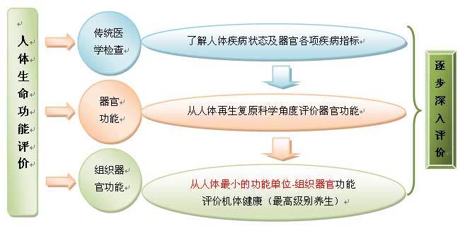 1、传统医学检查评价:我们之前按照十五大系统从现代医学角度评价身体健康,现在要按照再生医学即组织器官功能来评价。运用医学手段,即利用检查技术确定人体器官有无疾病,如果有疾病我们要再生复原它,癌变、衰老同样要复原。所以在人体生命功能评价方面,还要借助一些现代医学和生物技术的检查,先要了解和掌握人体器官的健康或疾病状况,而后进入人体再生复原科学的再生生命功能评价系统。