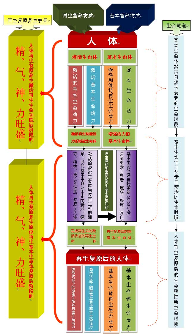 卵子与精子结合后,由一个细胞分裂成两个细胞,两个细胞分裂成四个细胞……,最终形成一个人体。在细胞分裂过程中有的细胞不再变化而潜伏下来,以前认为是没有功能的冬眠的细胞,其实它就是“潜能生命体”,是在组织器官发育形成的各个时期,由原始和多能干细胞增殖时产生的。“潜能生命体”以普通细胞形式参与组织器官的架构和功能形成,它包含“再生潜能细胞”及一些其他的未知潜能生命体。当人体组织器官的细胞出现纤维化、疾病、凋亡和异变时,细胞会释放一种特异蛋白,我们称之为“细胞死亡信号”,大脑接收这种信息后会释放再生激活物进入血液,“再生潜能细胞”在死亡信号的唤醒、再生激活物的激活以及再生营养物质创造的生命条件下,便可进入干细胞程序,原位启动自身增殖和分化的功能,及时补充器官中的细胞及组织的空缺,及时恢复器官的结构和功能,从而保障器官结构的完整和功能的正常。人体再生复原后“再生潜能细胞”被激活并加入到人体主体生命功能的发挥,同时具有增殖分化能力,再生出新的基本生命体,相当于人体增加了一个再生生命,所以说凡是接受人体再生复原科学养生的人均同时具备“两个生命”。