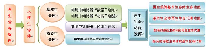 “再生生命功能”即是细胞吸收再生营养物质后产生的新生命活力和激活的潜能生命体的功能。细胞再生后生命体并未发生量的变化,细胞总量是一定的,多产生一个细胞都是肿瘤,而再生是实现细胞缺一个补一个、死亡一个换一个。当异常细胞经过再生更新后成为正常细胞,而一个正常细胞要发挥两种生命功能,一个是基本生命功能,另一个就是再生生命功能。此处重点阐述再生生命功能的发挥,如下图所示: