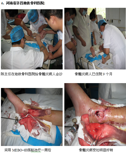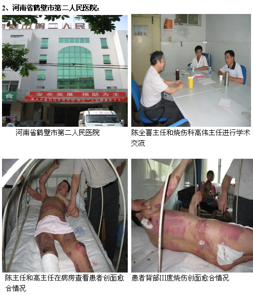 赤日炎炎似火烧,夏伏盛日温度高。2010年7月11日至28日,中国中西医结合烧伤专业委员会委员,全国特重病人抢救组专家,皮肤原位再生医疗技术推广专家陈全喜主任别对河南省鄢陵县人民医院、河南省鹤壁市第二人民医院、河南省滑县第三人民医院河南省许昌市地铁骨科医院的烧伤科进行了会诊,其中比较典型的病例如下:1、河南省鄢陵县人民医院2名火烧伤患者,烧伤面积均为96%TBSA以上的特重度烧伤患者;2、河南省鹤壁市第二人民医院患者杨某,男,22岁,热水泥烧伤,总烧伤面积为67%TBSA,均Ⅲ度烧伤创面;3、河南省滑县第三人民医院患者郭某,女,54岁,热液烫伤,烧伤总面积为68%TBSA,双下肢均为深Ⅲ度烧伤创面(肌腱外漏);4、河南省许昌市地铁骨科医院张某,男,38岁,外伤引发骨髓炎,住院已9个月,病情进一步恶化。