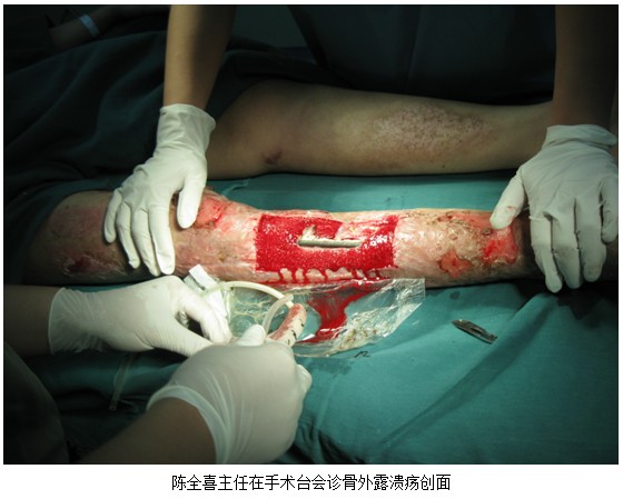患者王双,男,43岁。因机械事故造成右腿胫骨中段粉碎性骨折。用钢板固定住院治疗70天,伤口不愈合。陈全喜主任会诊后认为伤口不愈合有3个因素:局部组织已纤维化,创面得不到营养、细胞不分裂增殖③创面得不到一个良好的湿润环境,所以局部组织细胞不增殖分化,伤口不愈合,罗主任及大夫们认真汲取了建议。