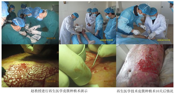 前不久,山东省乐陵县人民医院收治了一例大面积烧伤病人。患者韩XX,男性,38岁,工作中因甲醛发生爆炸,导致全身百分之八十五的大面积烧伤。事故发生后,在东营某医院治疗,因病情较重、生命垂危,回到家乡乐陵放弃治疗。在乡亲们的劝说下,又住进了乐陵县人民医院外科。病情就是命令,医院组织了以副院长高志平、科主任吴长青、住院医生鲁国军、护士长吴燕的抢救小组,立即采用再生医学技术实施救治。期间北京烧伤创疡研究所副所长赵瑞庆教授应邀也在第一时间赶到现场,亲自参加指导抢救工作,召开了病案讨论会,制定抢救方案。针对创面较大,积极采用再生医学快速愈合技术皮簇种植方法。截止目前,创面已成功愈合三分之二。