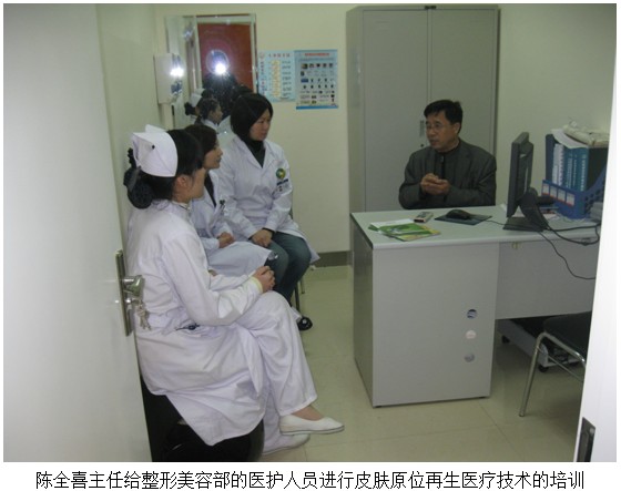 2012年11月5日,中国中西医结合学会烧伤专业委员会委员、北京美宝烧伤研究所临床部专家陈全喜主任应邀来到郑州大学第二附属医院医学整形美容科,对医学整形美容科的医护人员进行皮肤原位再生医疗技术的专业培训。