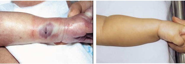 患儿胎龄33+1w,出生18d后,在左前臂进行12.5%的全肠胃外营养输液中发生渗漏,左前臂出现皮下水肿和局部组织坏死(图3),创面出现直径为0.5cm X 1cm的部分厚皮缺损。在水肿出现的一个小时内,使用再生技术处理,一个月后,创面全部愈合。